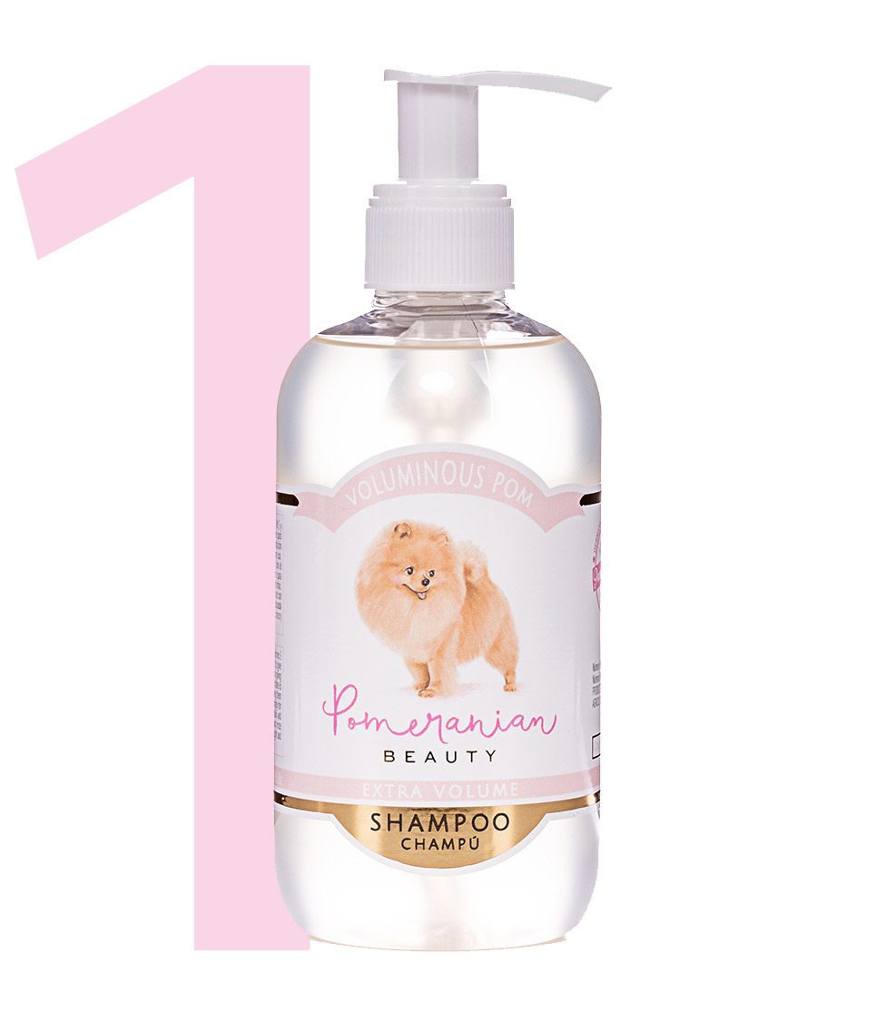 The formula of Voluminous Pom Pom Shampoo enriched with collagen, Vit E and B5 and Oligosaccharides, is a powerful vitamin cocktail specially formulated to give a spectacular volume to the Pomeranian's coat.